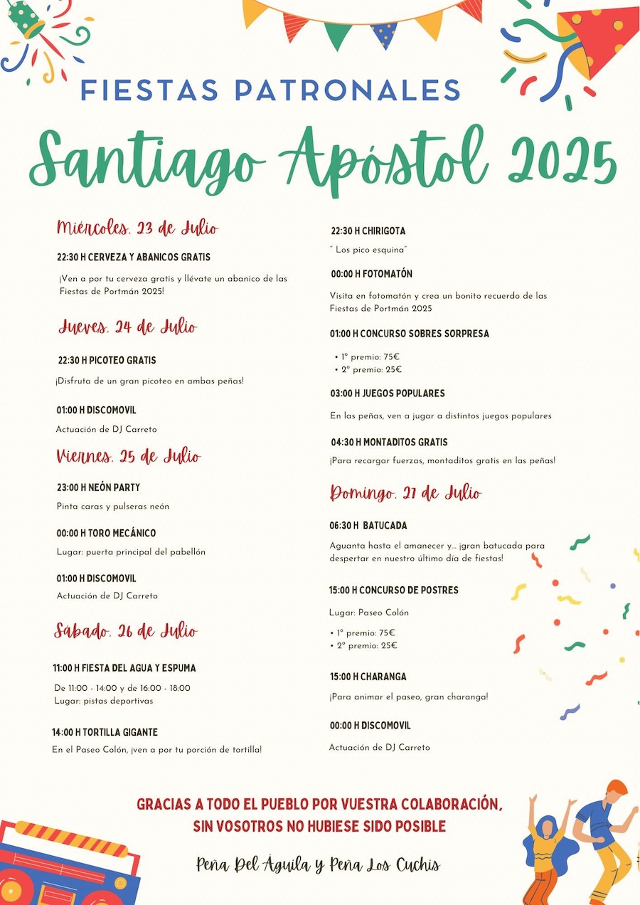 Las fiestas patronales inician hoy el grueso de su programación con la coronación de la corte real y el pregón de María del Carmen García, secretaria de la asociación de vecinos. Antes hay inicio del torneo de parchís y partidos de fútbol y después actuarán la banda musical 'La prima' y DJ Rául. Las dos peñas locales regalarán abanicos portmaneros. La Policía Local informa que está prohibido estacionar en el entorno del nuevo recinto festero. En la foto, el cartel de esta edición y la reina y damas juveniles