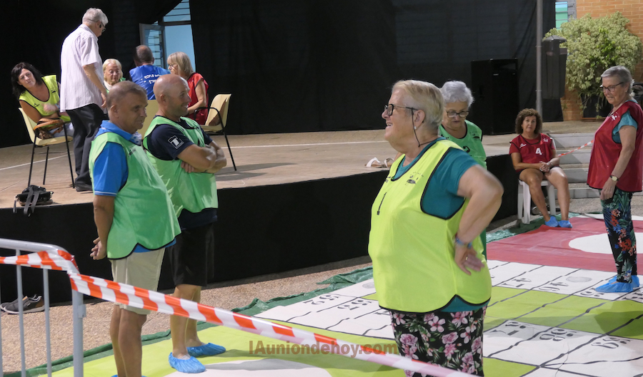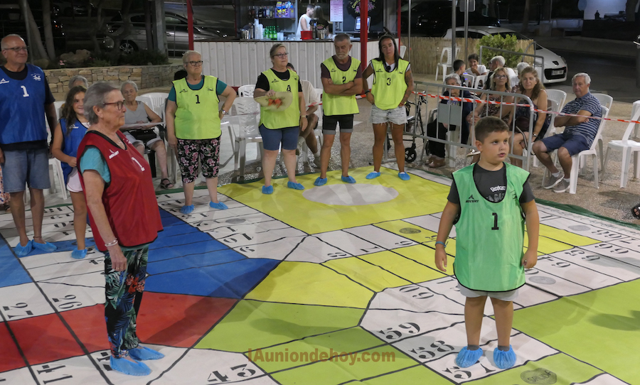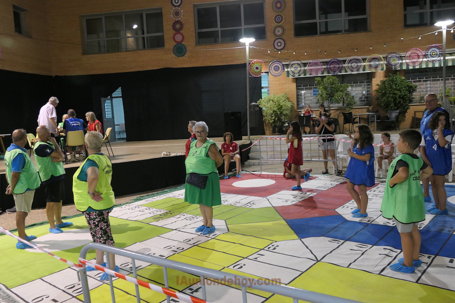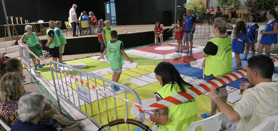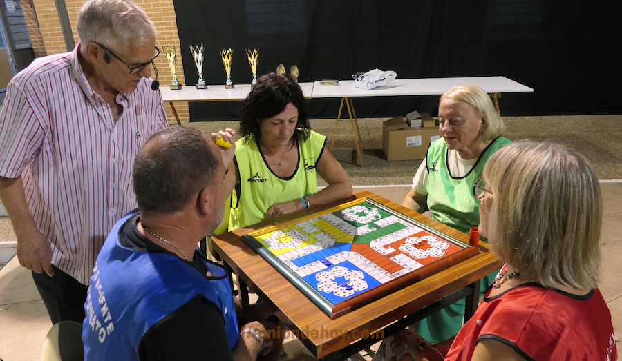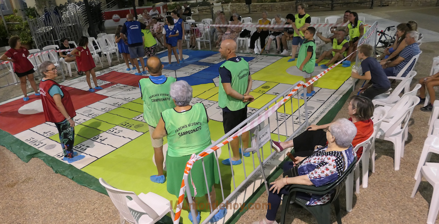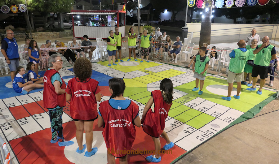 Cuatro jugadores con petos de los colores de las casillas del tablero (amarillo, azul, rojo y verde) sentados fueron los encargados de lanzar el dado para la disputa de una partida que tuvo su réplica en el gigantesco tablero situado en el centro de la plaza, donde equipos de cuatro personas representaban de forma humana a las típicas fichas.
