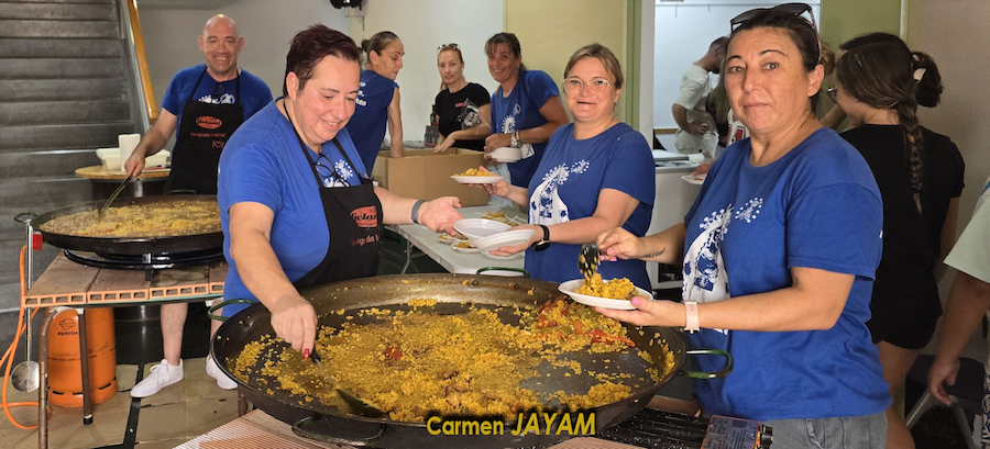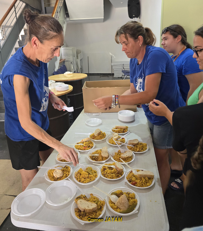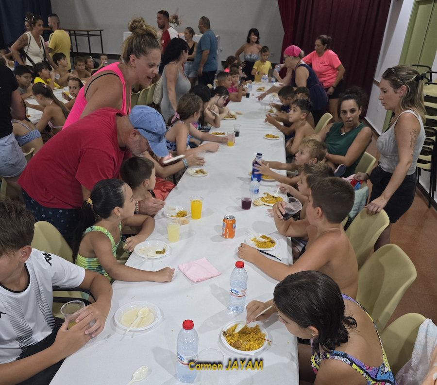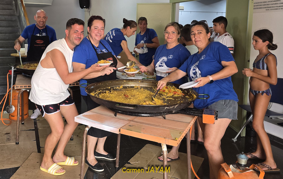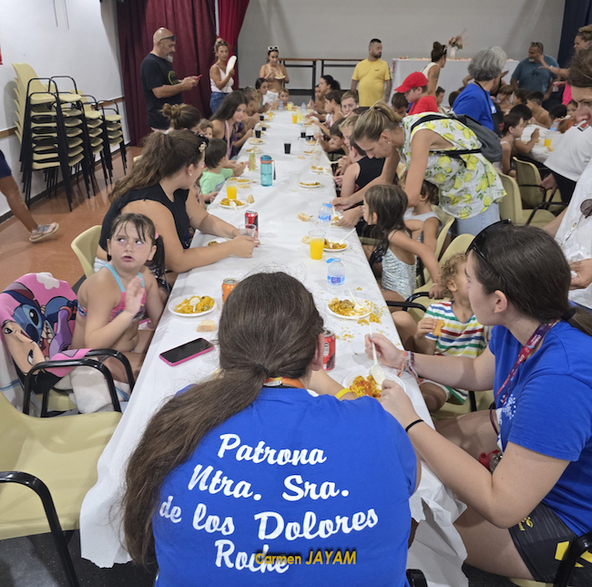 El equipo de las damas portapasos de la Virgen de los Dolores prepararon ayer los arroces que se repartieron entre los chavales en las fiestas rocheras, culminando con reparto de helado.