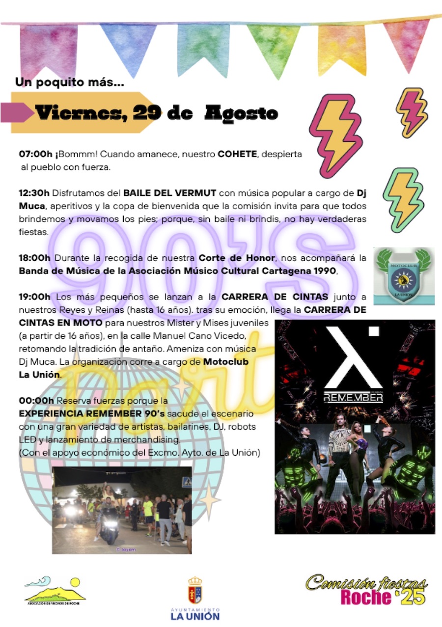 El baile del vermú, aderezado con la copa de bienvenida, aperitivos y la música de DJ Muca, tiene lugar esta mañana. Por la tarde, recogida de la corte de honor por parte la banda de música con destino a las careras de cintas en moto. A partir de la medianoche actuará 'Experiencia Remember 90's' ofreciendo un espectáculo con artistas, bailarines, DJ y robots LED.