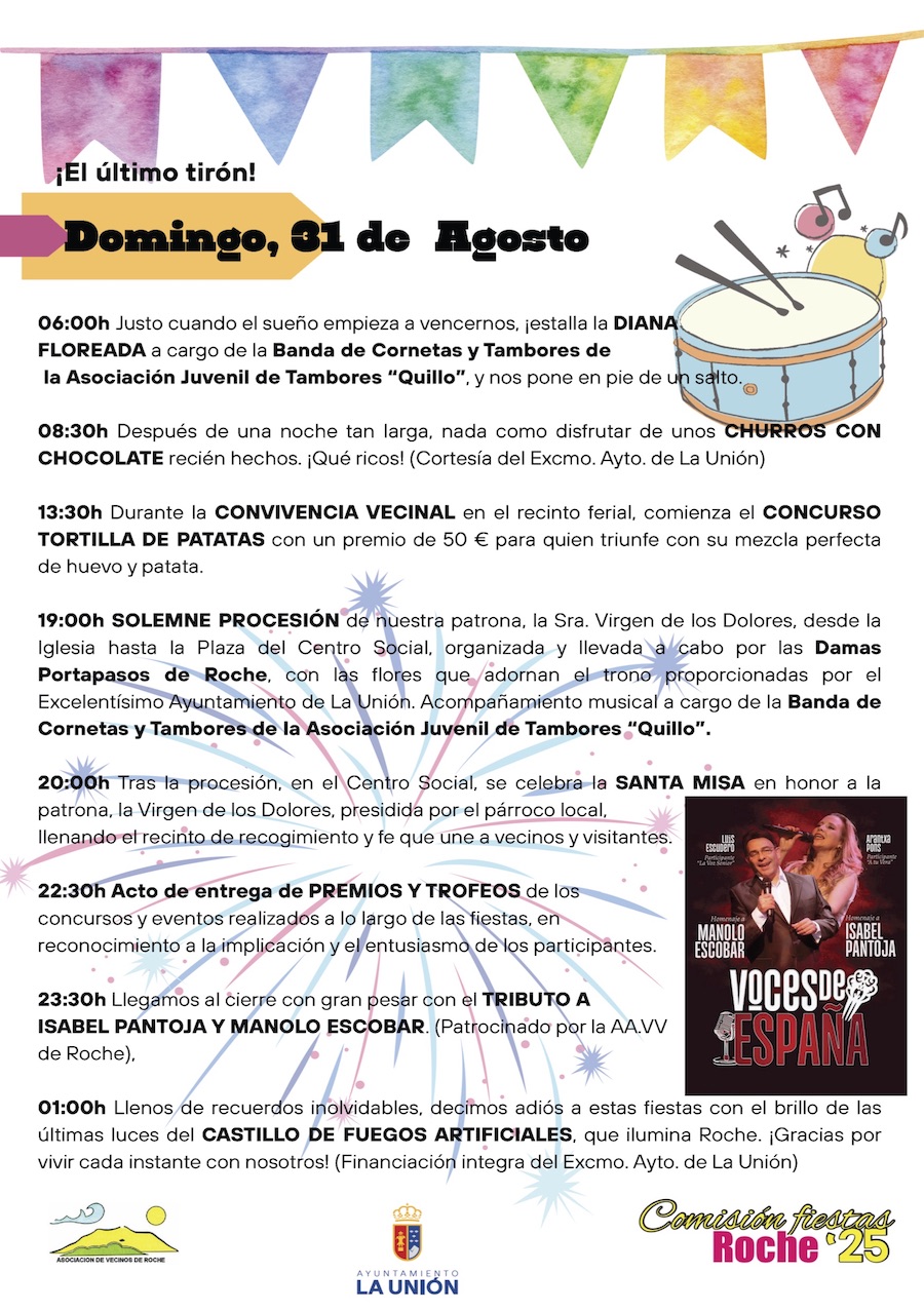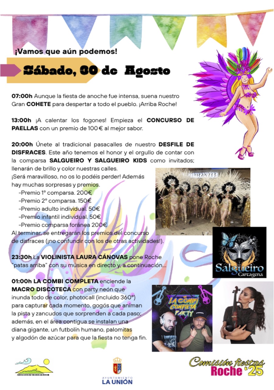 El concurso de arroces llega este sábado, jornada en la uqe el desfile de disfraces contará con el refuerzo de las comparsas adulta e infantil de 'Salgueiro', de Cartagena. Hay cinco premios con dotaciones económicas para los participantes. Más tarde, cerca de la medianoche, comenzará un concierto de violín de Laura Cánovas que promete ser vibrante. Después, ya en la madrugada, macrodiscoteca con 'party neón', gogós zancudos, diana gigante, futbolín humano... Y a las seis de la mañana diana floreada con la banda de tambores 'Quillo' para comenzar el cierre de las fiestas.