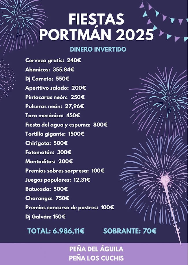 La peña 'Los Cuchis' de Portmán dio a conocer de forma pública, a través de sus redes sociales, el dinero invertido en las actividades que realizó en las fiestas patronales de julio junto a la peña 'El Águila', además de agradecer su colaboración a todos los que hicieron posible esa recaudación, de casi siete mil euros, que se detalla por conceptos.