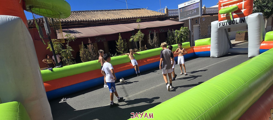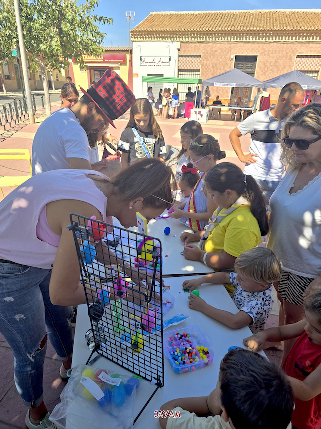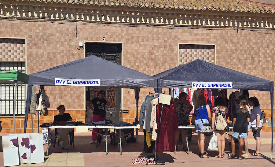 La matinal del sábado tuvo como alicientes en las Fiestas de El Garbanzal un mercadillo de segunda mano organizado por la asociación de vecinos y la celebración de juegos populares, partidos de chapas, futbolín viviente, exhibición de 'Kangoo Club Lugarma Murcia', toro mecánico y el taller infantil 'Re-tocando los güevos' a cargo del showman 'Bob Eggsponnja', además de una sardinada a precios populares.