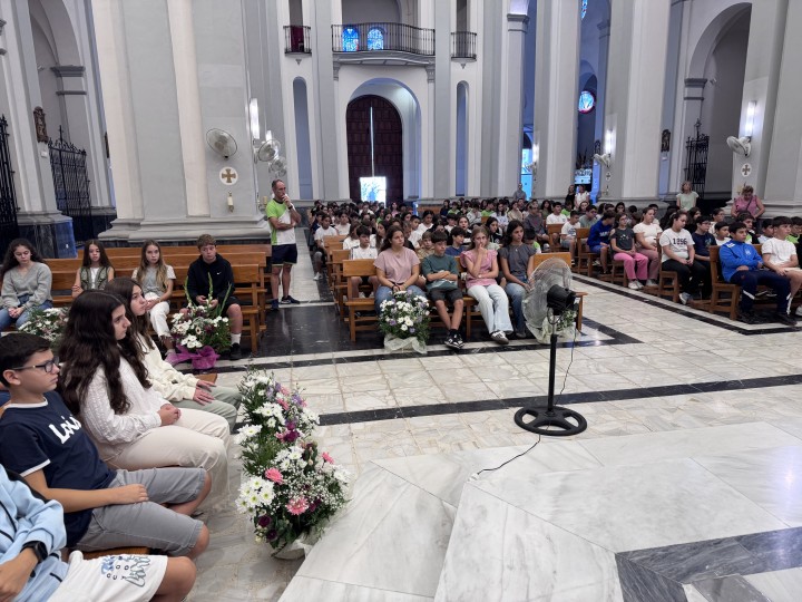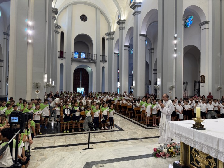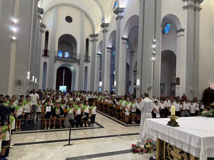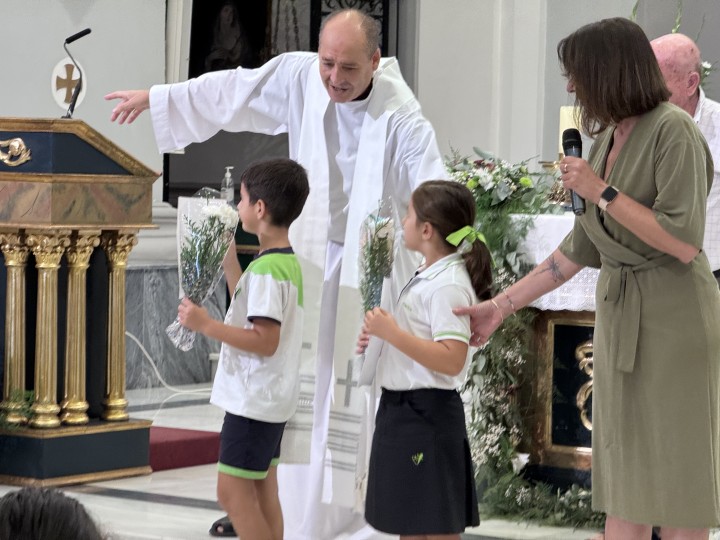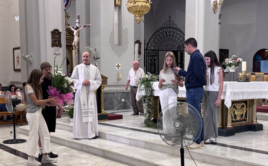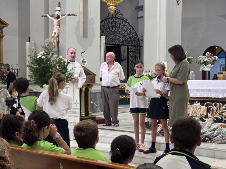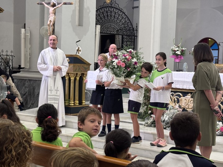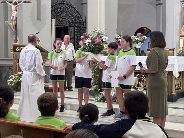 Las fiestas en honor a Nuestra Señora del Rosario acogieron su primer acto del programa oficial con el encuentro de los escolares con la patrona en el templo, donde se llevó a cabo la tradicional ofrenda floral.