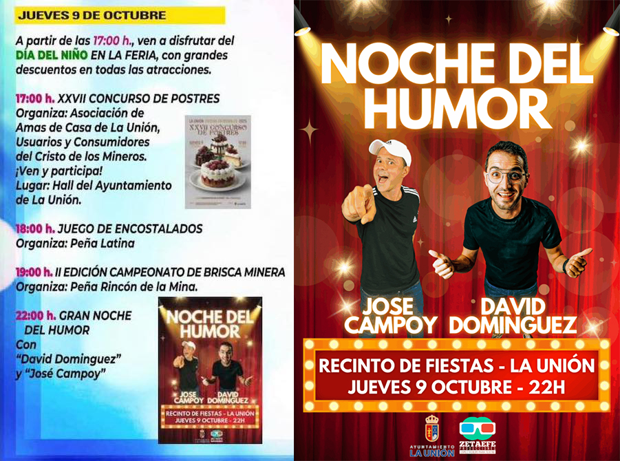 Siempre que el clima no lo impida, el programa de las Fiestas del Rosario ha previsto para este 9 de octubre la tarde del niño en la feria, con descuentos en las atracciones. También el XXVII concurso de postres que organiza el colectivo de amas de casa. En el recinto de la plaza de Joaquín Costa hay juegos peñistas y, por la noche, el humor de David Domínguez y José Campoy.