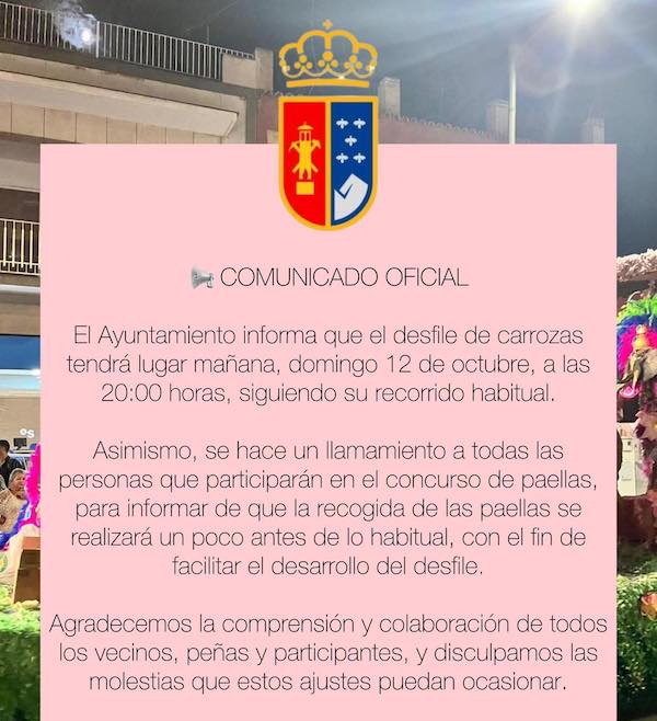 El ayuntamiento informa que el desfile de carrozas de las fiestas en honor a Nuestra Señora del Rosario se celebrará el domingo a partir de las ocho de la tarde por su recorrido habitual.