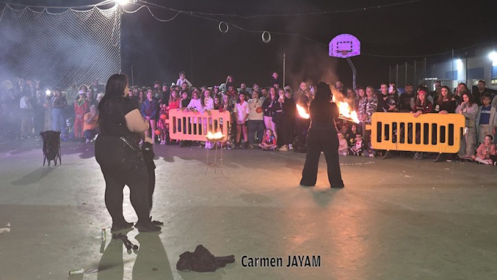El punto de partid¡a ha sido el ‘Vídeo 360’, para a continuación tener lugar en la pista polideportiva un espectáculo de fuego con dos damas negras de ‘Animaciones Marín’.
