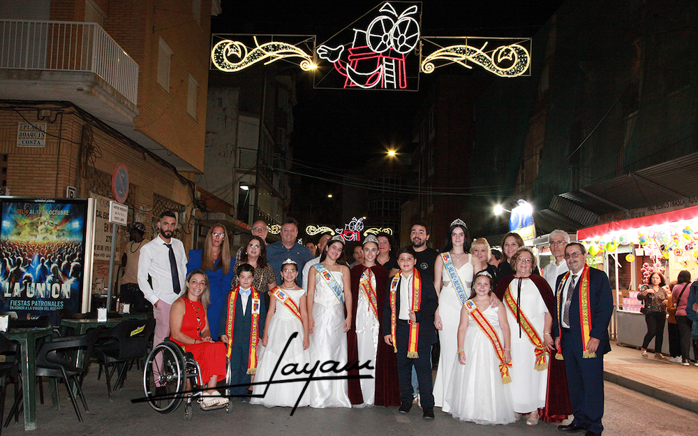 La corte real de las fiestas del Rosario y del centro de personas mayores, junto con las autoridades y la pregonera, en el acto de encendido de la iluminación festera de la calle Mayor.