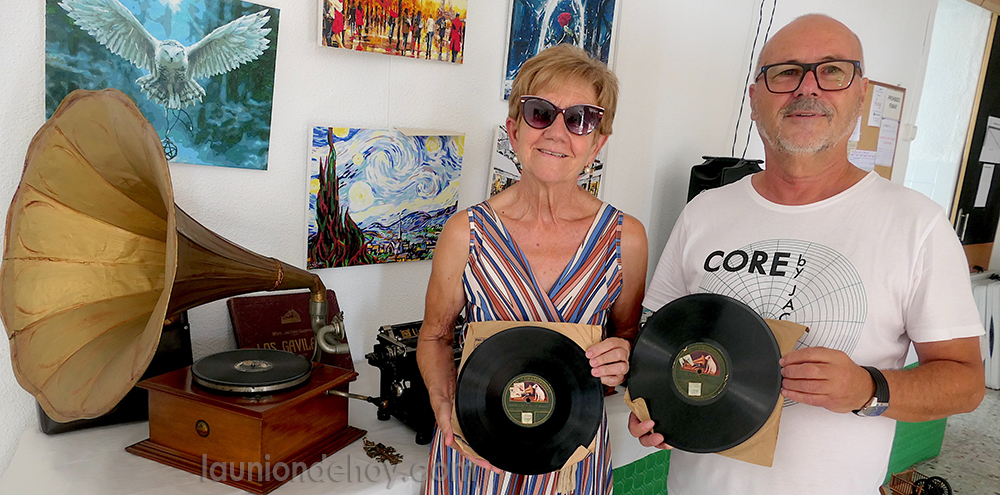 Nacida en La Unión en 1886 y con una calle a su nombre en la ciudad minera, 'La Satisfecha' fue una de las más famosas artistas de su época interpretando copla, flamenco y cantos regionales por toda España. En la exposición que se inaugura esta tarde en el local social de la villa unionense se podrán ver algunos de los escasos discos de gramola que quedan de la cantante. Con ellos posa el matrimonio formado por Fausti y Paco.