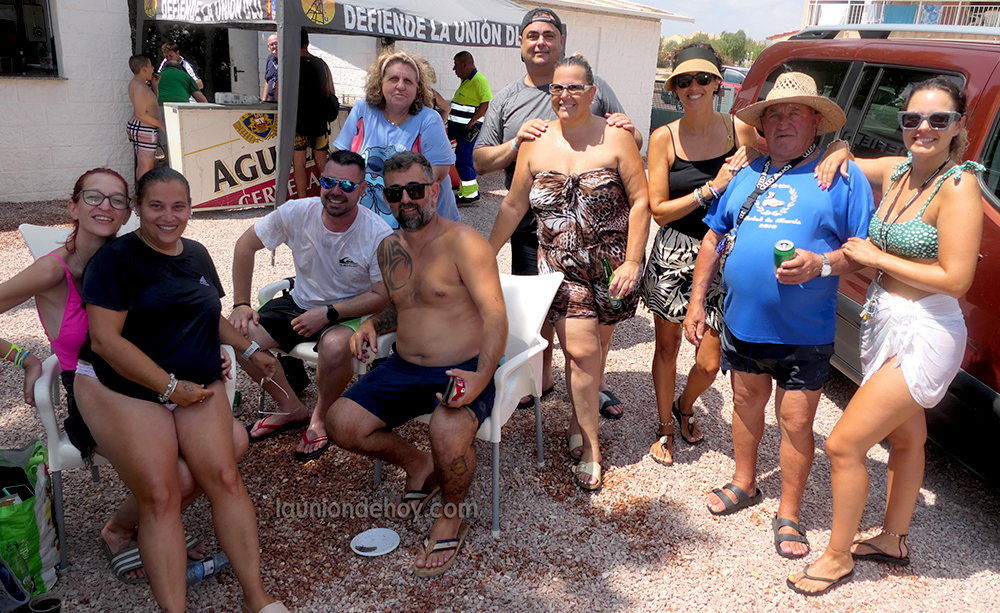 Imagen de una muestra de la colonia unionense que veranea en Islas Menores, donde su asociación de vecinos tiene como presidente a Daniel Roca, edil de DLU en el consistorio de La Unión. La foto está tomada durante una popular jornada de fiesta del agua con reparto gratuito a los socios de 53 kilos de morcillas, 700 litros de cerveza y 150 de tinto de verano.