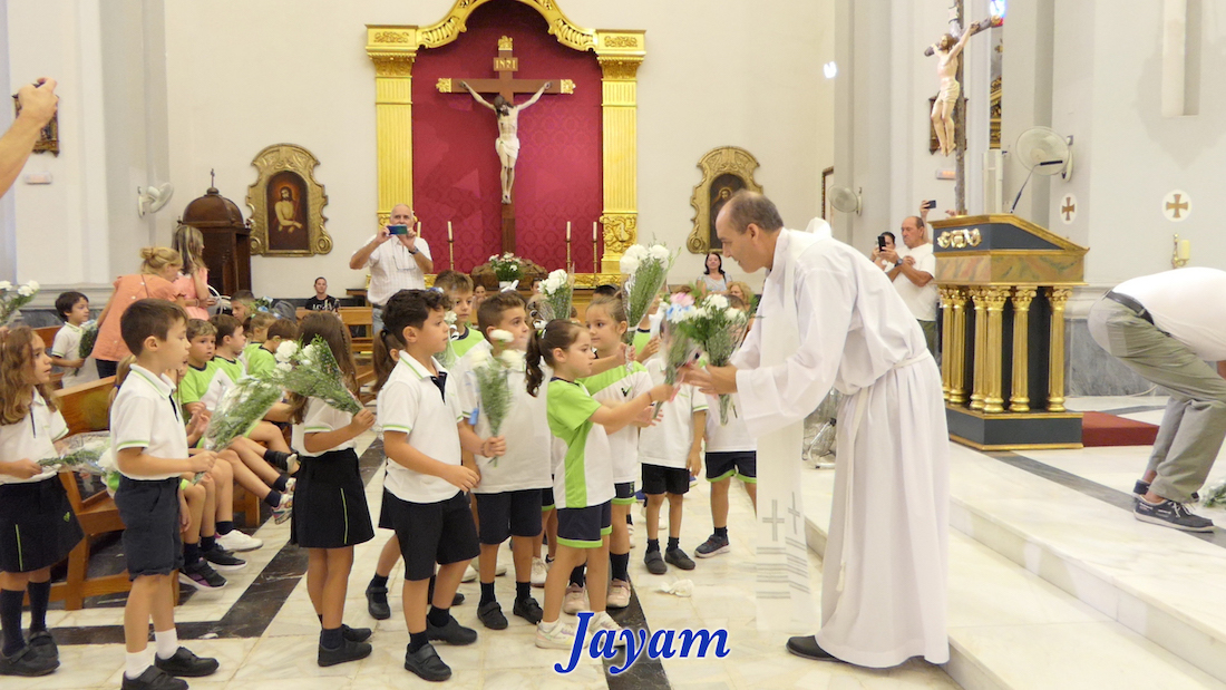 Las fiestas patronales han comenzado con la ofrenda de los alumnos de los colegios de La Unión a la Virgen del Rosario en su templo, en un acto en el que el párroco, Ginés Luis Vicente, ha explicado a los chavales el valor de una madre y el significado del 'rosario'.