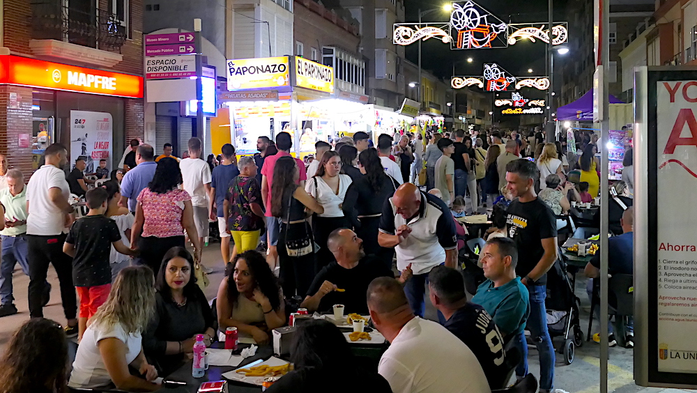 Esta mañana es la marcha solidaria de la junta local de la Asociación Española contra el Cáncer, con posterior ‘caña solidaria’. Después, arroz gigante en el recinto festero, donde por la tarde se anuncia concursos por las peñas, aunque esto no siempre se cumple (ayer no se celebraron los de comer melón o correr dentro de sacos). Por la noche, la gran cabalgata de disfraces. Además, esta mañana, como informamos ayer, hay actos gratuitos en el Mercado Antiguo y en el Museo Minero del Festival Internacional de Literatura en Español (FILE). En la foto, el ambiente que había anoche en el centro de la ciudad.