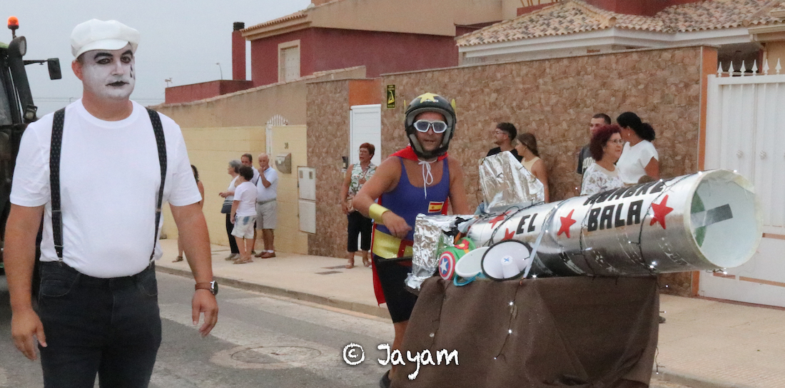 Diversos disfraces confluyeron en el desfile de disfraces de las Fiestas de Roche que cerró la carroza con la corte de honor. En la imagen, un mimo y el hombre bala del circo.