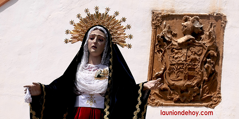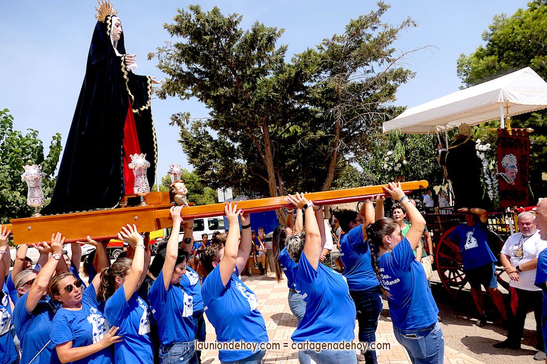 La Virgen de los Dolores fue la protagonista de la jornada de cierre de las fiestas de Roche. Fue llevada a hombros de su agrupación femenina de portapasos y presidió la misa de campaña en la plaza del centro social.
