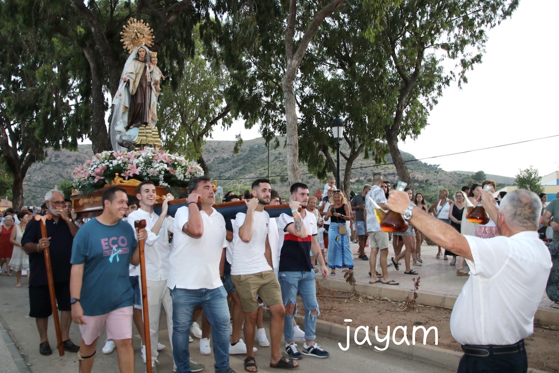 La imagen de la patrona recorrió el trayecto desde su templo hasta la explanada del puerto pesquero a golpe de tambor, con paso procesionista, para en el regreso, después de celebrar la eucaristía, avanzar 'bailando' sobre los hombros de sus portapasos con música de pasodobles. En la imagen, un eufórico 'viva' con doble porrón.