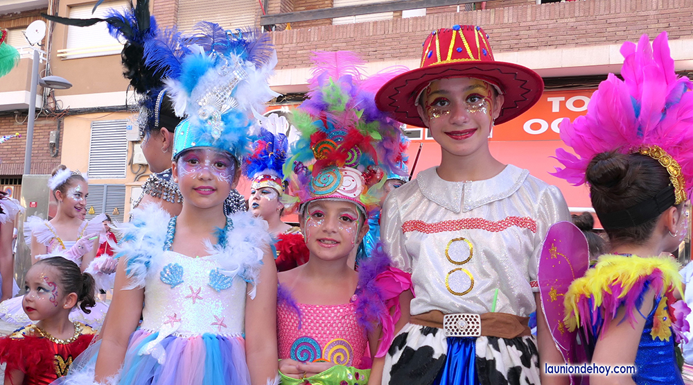 Sofía García y los hermanos Carmen y Lola Martínez Nicolás participaron ayer en el gran desfile del Carnaval de Cartagena dentro de la comparsa MarDance de El Algar.