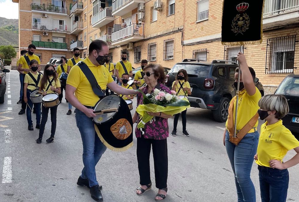 La banda de cornetas y tambores Virgen de la Caridad protagonizó una agradable sorpresa a Maruja Vicente al entregarle, sin avisar, un bonito ramo e iniciar el tradicional pasacalles del ‘Día de la patrona’ desde la puerta de su domicilio en homenaje a quien ese día hubiese sido la encargada de vestir con atuendo regional a las reinas, reyes y damas de las fiestas unionenses.