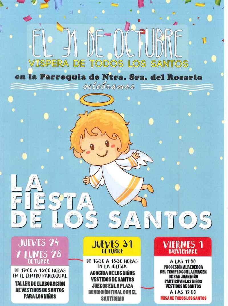 La parroquia de Nuestra Señora del Rosario ha acogido una celebración en la que 'santos' y 'ángeles', entre otros personajes católicos, han disfrutado de diversos juegos y se han preparado para la festividad de Todos los Santos, siendo la siguiente actividad este sábado con una procesión a las once horas en el entorno del templo con la imagen de San Juan Niño, la cual culminará con una eucaristía.