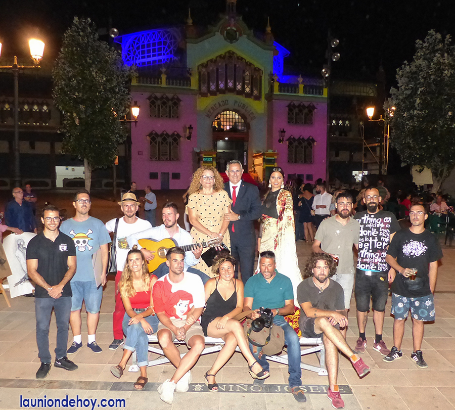 Los dos jóvenes artistas (y por primera vez modelos) con Federico García, presidente de la asociación Tertualia Mesa Café de La Unión