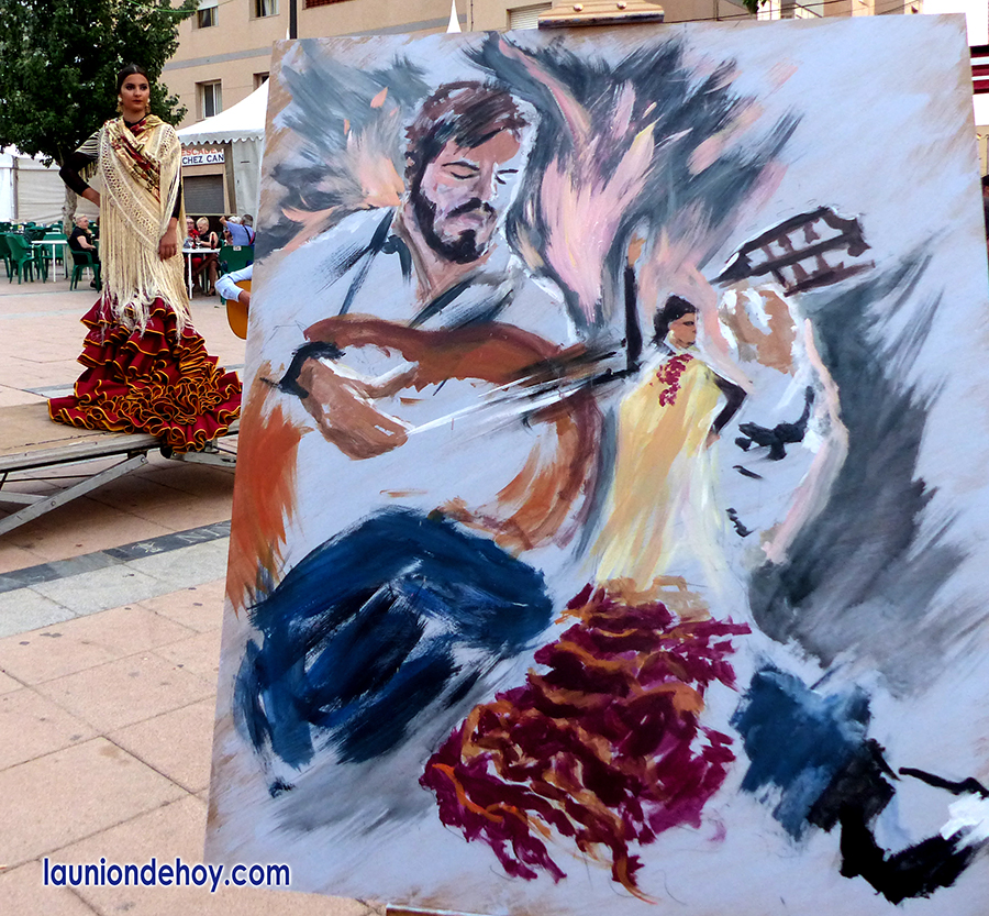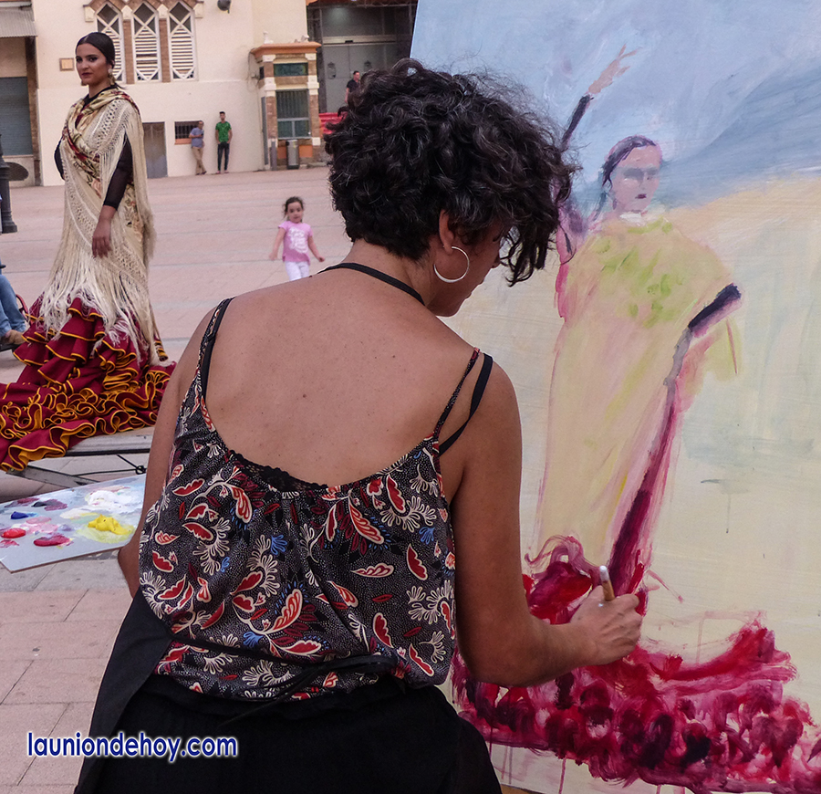 Los viandantes que ayer tarde pasaron por la plaza Joaquín Costa, transformada en la ‘Avenida del Flamenco’ durante el Festival del Cante de las Minas, pudieron ver la elaboración de obras pictóricas, desde el primer contacto del pincel con el lienzo hasta el último, además de observar las diferentes perspectivas y conceptos de cada artista.