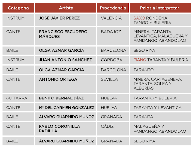 1. Francisco Escudero Márquez (Badajoz). Participa en el palo Minera y en cantes mineros, cantes por Málaga, Granada y Córdoba. Desde muy joven entró en la senda de lo jondo sabiendo empaparse de todos los matices flamencos posibles, dadas sus vivencias y gran afición. Siempre ha estado relacionado con la figura del gran bailaor extremeño Antonio Silva Giles “El Peregrino”, del que ha aprendido los valores de este arte. En 2010 consigue la preciada beca flamenca “Porrina de Badajoz”, otorgada por la Excma. Diputación de Badajoz, la cual hace que un año después se desplace a ampliar sus conocimientos del flamenco a la Fundación Cristina Heeren de arte flamenco (Sevilla 2011- 2012). Ha realizado festivales flamencos, peñas flamencas y también giras internacionales: Flamenco del Sur, Compañía Cobeña flamenco de Madrid (Israel, 2012), Compañía flamenca “La Rosa del Penal” (Eslovenia, Liubliana, 2014), espectáculo “De Raíz” Francisco Escudero “El Perrete” (Zagreb, Croacia, 2014) o recital flamenco en “FLAMENCO EN FRANCE” (París, 2016).