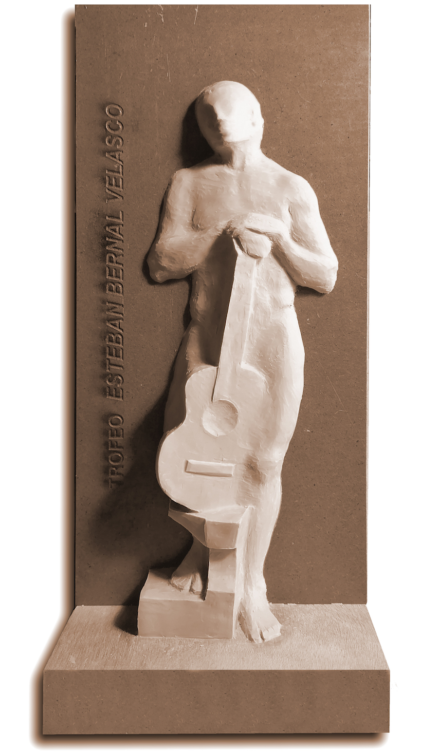 iconografía en altorrelieve de 35 cm de altura que representa “a un hombre con la cabeza erguida y la mirada puesta en el futuro, siempre adelante; un visionario inspirado por la fe en un proyecto, aunque su desnudez ponga de manifiesto que no cuenta con más medios que el poder de su ilusión”, señala el autor. Las dos manos las mantiene unidas en el pecho junto al corazón, apoyadas en el mástil de una guitarra que representa al Flamenco con mayúsculas. En ella reside el apoyo y su descanso. El descanso porque se deleita en el cante que parece escuchar prestando el oído al elevar su cabeza.