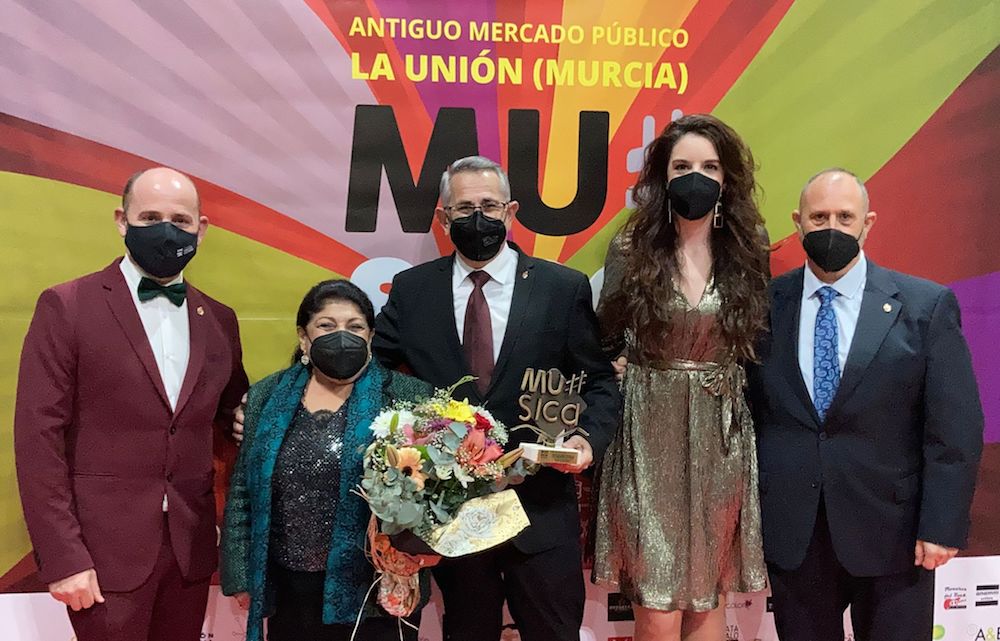 Durante la entrega de galardones, el municipio de La Unión se sumaba al homenaje de los Premios de la Música a Alberto Nieto Meca, fundador del Festival Internacional de Jazz de San Javier, al que el alcalde entregaba una réplica en miniatura del Antiguo Mercado Público, como gesto de generosidad y apoyo a la cultura durante su labor en el Ayuntamiento de La Unión.
