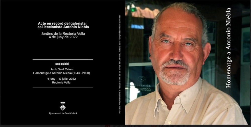 El galerista Antonio Niebla será homenajeado el próximo 4 de junio en San Celoni, Barcelona, lugar donde residió sus últimos 25 años de vida y donde abrió su última galería. A este acto, que tendrá lugar a las 18:00 horas en los Jardines de la Rectoria Vella, llegará el flamenco con una actuación del cantaor Víctor Palacios, que cerrará el acto gracias a la colaboración de la Fundación Cante de las Minas, además de contar con recitales, intervenciones y otras piezas musicales interpretadas sus familiares.