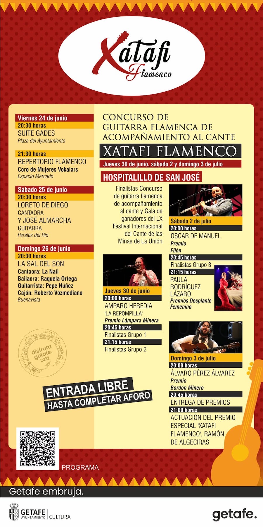 ‘Xatafi Flamenco’, como se denomina a este encuentro, tendrá lugar los días 30 de junio y 2 y 3 de julio en el Hospitalillo de San José, y contará con la presencia del presidente de la Fundación Cante de las Minas, Pedro López, la vicepresidenta, Elena José Lozano, y el director, Juan Carlos López. Ambas localidades ya han estado unidas en torno al flamenco anteriormente al ser Getafe una de las sedes de las pruebas selectivas de pasadas ediciones del Festival.