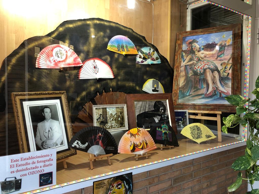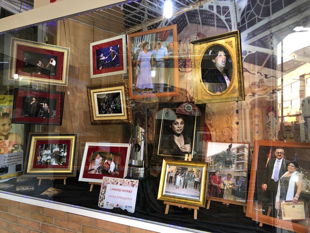 Los escaparates de la tienda de fotografía de la calle Mayor están adornados con imágenes y elementos que ambientan las fechas flamencas que se avecinan, siendo enriquecidos por los premios de la ‘Lámpara minera’ y ‘Pencho Cross’ que se entregarán en esta edición.