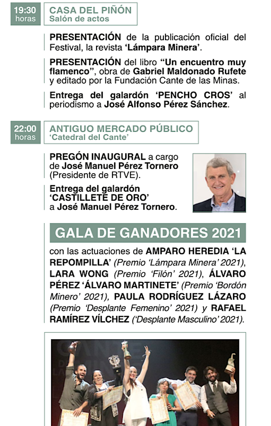 Es el día del pregón (José Manuel Pérez Tornero, presidente de RTVE) y de la gala de los ganadores de 2021 en la edición celebrada en La Maquinista de Levante, por lo que será la primera vez que Amparo Heredia ‘La Repompilla’, Lara Wong, Álvaro Pérez ‘Álvaro Martinete’, Paula Rodríguez Lázaro y Rafael Ramírez Vílchez pisen la 'Catedral del cante' como triunfadores del festival. Además, a las 19.30 horas se presenta la revista 'Lámpara minera' dirigida por Lydia Martín y del libro de Gabriel Maldonado para acercar a los niños al flamenco. Por su parte, el unionense José Alfonso Pérez Sánchez (foto adjunta) recibirá el galardón ‘Pencho Cros al periodismo'.