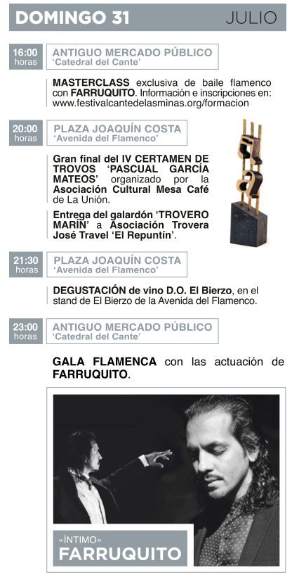 Las galas flamencas continuarán a partir de las 23:00 horas de la mano del bailaor sevillano Juan Manuel Fernández Montoya ‘Farruquito’, quien vuelve a La Unión con su espectáculo ‘Íntimo’, y que protagoniza por la mañana en la ‘Catedral del Cante’ una masterclass exclusiva de baile flamenco.