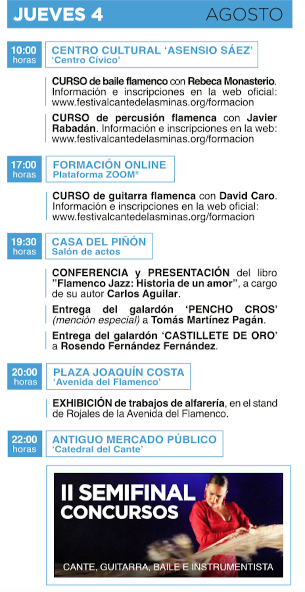 La jornada finalizará a las 22:00 con la segunda semifinal de los concursos en los que actuarán María del Carmen González Vento (Huelva), Francisco Javier Heredia Fernández (Jaén), Rocío Belén Cuesta Espina (Huelva) y Baldomero Cortés Heredia (Almería) en la categoría de cante, con Rosendo García Fernández como aspirante al Premio Especial Cantaores Jóvenes; en baile concursarán Julio González Ruiz (Almería) y Sandra Cisneros Cisneros (Málaga); en guitarra, Álvaro Mora Domínguez (Huelva) y José marco Serrato Gómez (Sevilla); y en instrumentación Yusuke Morita (Japón) al bajo e Irene Ortega Albaladejo (Cartagena) al violonchelo.