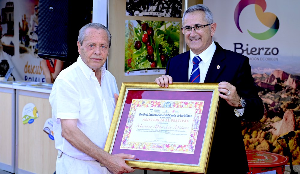 Esta atracción hacia el cante y sus tradiciones permanece de manera ininterrumpida desde hace 50 años, motivo por el que la Fundación del Cante de las Minas le ha querido rendir homenaje dentro del marco de la Agenda Cultural, al que han acudido miembros de la Peña Flamenca Salmerón ‘La Uvita’ de Alcorcón para interpretar una pieza musical. “Simplemente, gracias”, intervenía emocionado Mascuñán, con la corrección del presidente de la Fundación, Pedro López, porque “el agradecimiento recae en todo el municipio de La Unión, pues personas como Mariano son las que hacen grande tanto a nuestro Festival como municipio”. El homenaje no podía contar con un mejor cierre, que el protagonizado por el cantaor onubense Pepe Pedrajas junto a la guitarra de José Luis Pastor, quienes aparecieron sobre un improvisado escenario para interpretar una serie de cantes mineros.