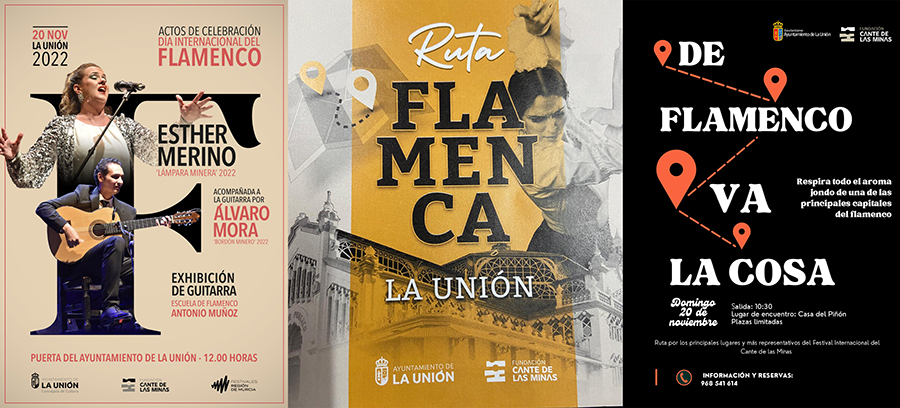 El Ayuntamiento de La Unión y la Fundación del Cante de las Minas han presentado una ruta del flamenco por las calles de la ciudad minera que ayudará al visitante a descubrir las raíces de este arte desde hace más de 60 años. El itinerario urbano recorre los principales escenarios emblemáticos que conectarán al visitante con el pasado e historia del legado artístico del flamenco a través de edificios, personajes y la gastronomía típica de La Unión ( Catedral del Cante, Peña Flamenca, casas de Pencho Cros, de Esteban Bernal, de Encarnación Fernández o la Bodega Lloret o el Restaurante El Vinagrero…etc).