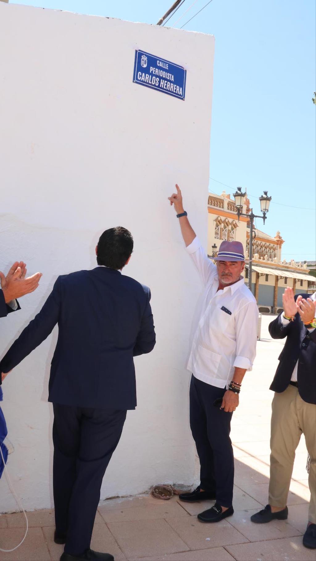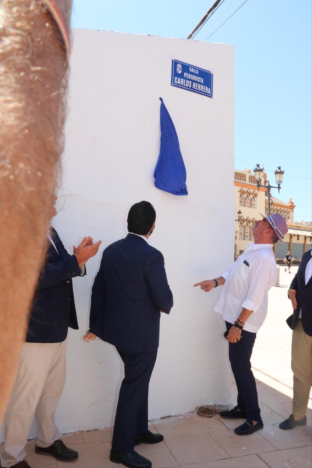 A continuación se trasladó en compañía de el alcalde, Joaquín Zapata; del presidente de la Comunidad Autónoma, López Miras; y del senador unionense, Francisco Bernabé; además de consejeros regionales y del equipo de gobierno local, entre otros, unionenses a destapar el nombre de una calle "Periodista Carlos Herrera" situada junto a la Catedral del Cante de las Minas.