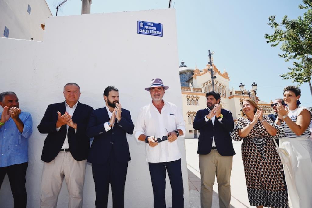 El jefe del Ejecutivo regional en funciones, Fernando López Miras, presidió hoy el acto de descubrimiento de la placa en la calle que da nombre al periodista Carlos Herrera en el municipio La Unión, y que supone “un justo reconocimiento a una figura de una relevancia profesional y mediática fuera de toda duda en nuestro país”, en palabras del presidente.