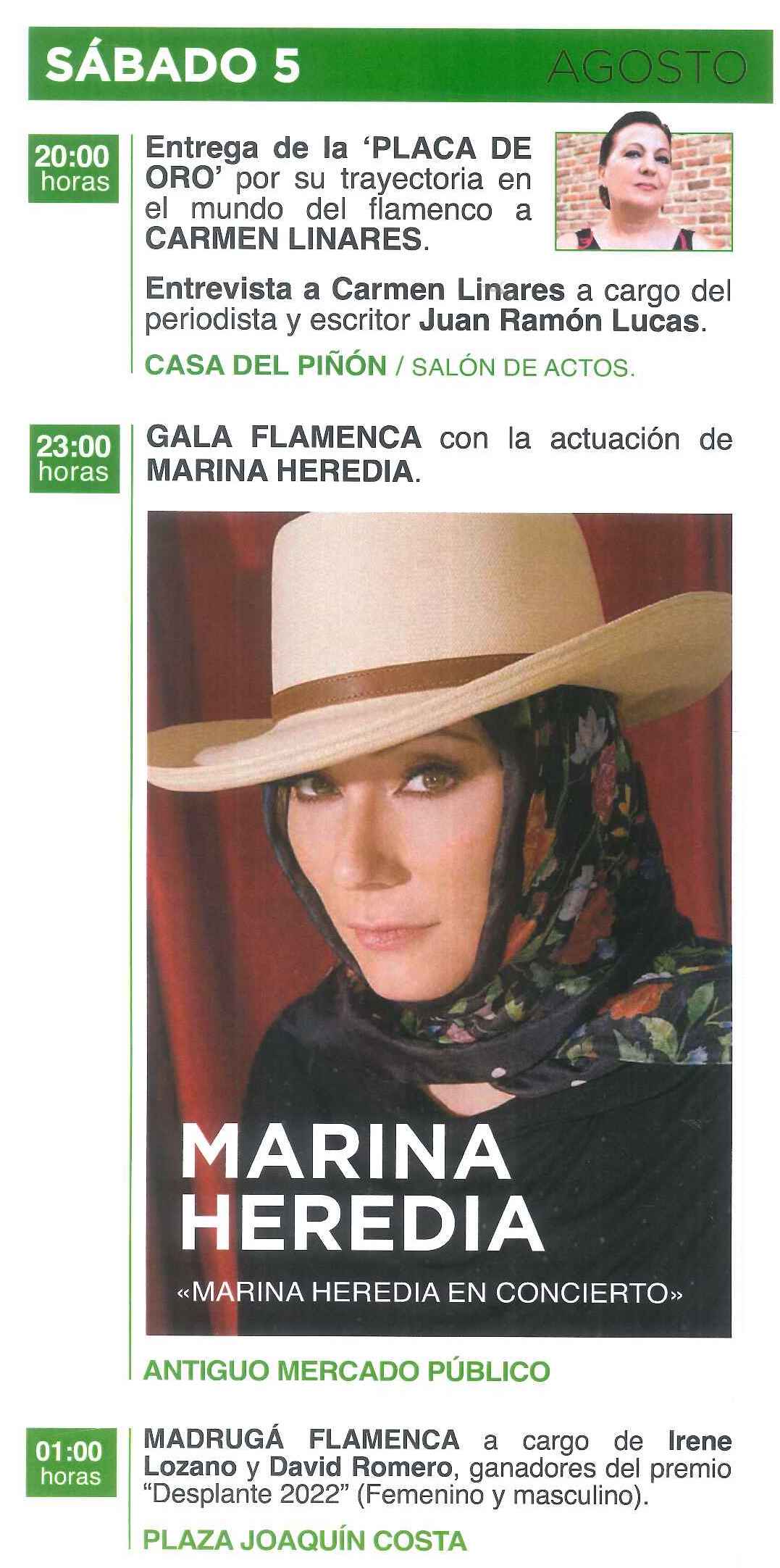 También habrá eventos durante la tarde dentro de la Agenda Cultural, en el Salón de Actos de la Casa del Piñón. Desde las 20:00h se entregará la ‘Placa de Oro’ por su trayectoria en el mundo del flamenco a Carmen Linares. El acto se completará con una entrevista ganadora del ‘Princesa de Asturias’ de las Artes 2022 a cargo del periodista y escritor Juan Ramón Lucas. Por último, el ‘duende’ volverá a las madrugadas de La Unión, a cargo de Irene Lozano y David Romero ‘Desplantes’ 2022, en el entorno de la Plaza Joaquín Costa.