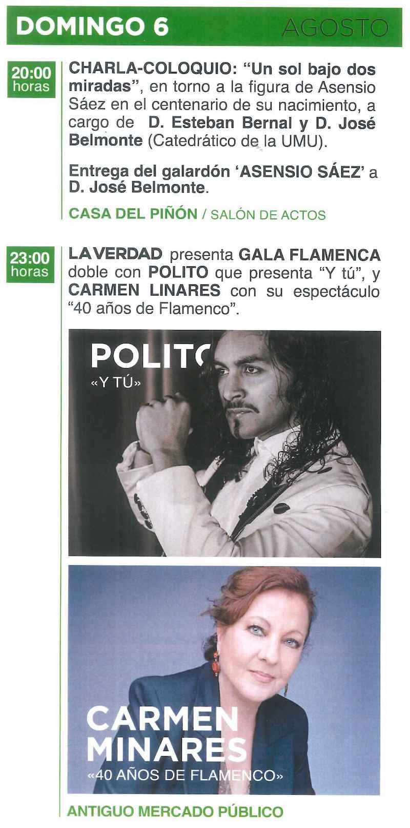 Nueva jornada del LXII Festival Internacional del Cante de las Minas. Por la tarde, protagonismo para Asensio Sáz en el centenario de su nacimiento con una charla de Esteban Bernal y José Belmonte, quien después será galardonado. Por la noche, Polito y Carmen Linares ofrecerán su arte en la 'Catedral del Cante'.