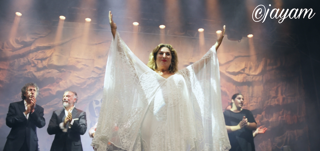 La caña fue el palo elegido para abrir el espectáculo, mostrando el virtuosismo de su voz con ciertos toques de fusión, que continuó añadiendo ritmo con fandangos de Granada y tangos. Con la ‘Habanera imposible’ de Carlos Cano le cantó a Granada: ‘Granada es como una rosa/ Más bonita que ninguna/ Que se duerme con el Sol /Y florece con la Luna’.
