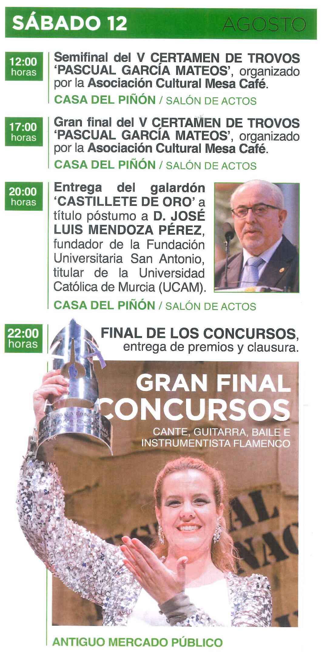 Capítulo final. La mañana (12 horas) y la tarde (17 horas) son, con entrada gratuita, para los trovos en la Casa del Piñón con el memorial 'Pascual García Mateos' en disputa. El capítulo de homenajes se cierra con el 'Castillete de oro' a título póstumo a José Luis Mendoza, fundador de la UCAM. Por la noche, la gran final, con todas las entradas vendidas.