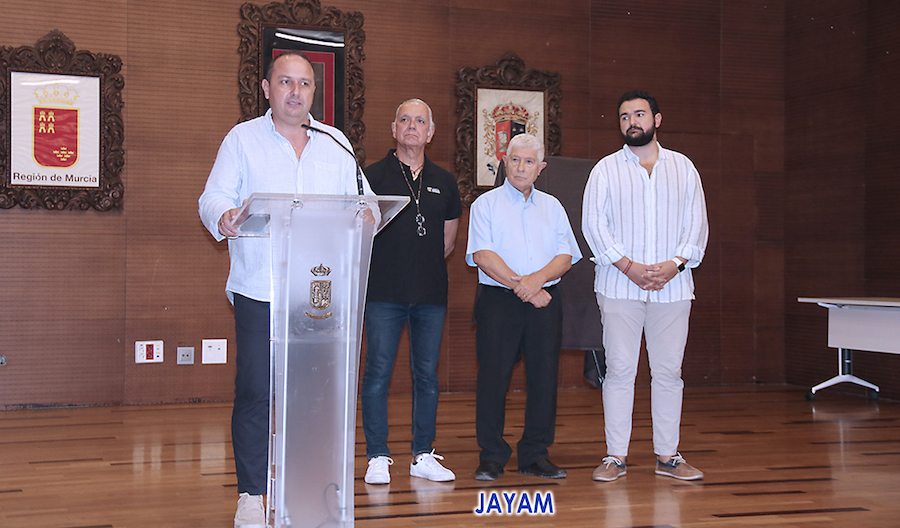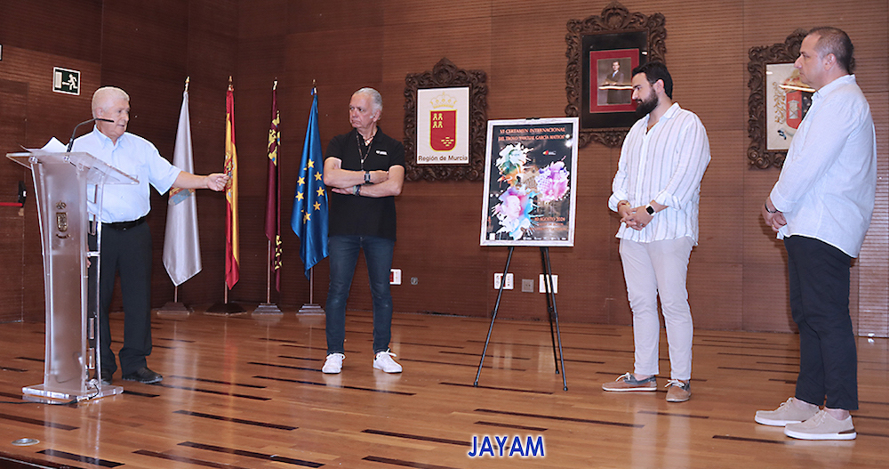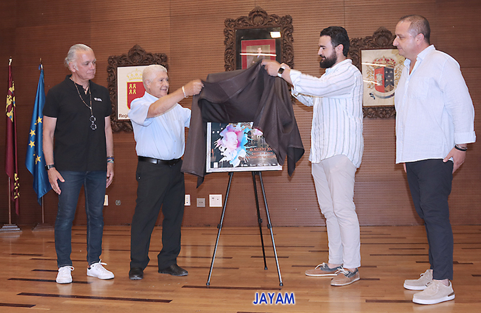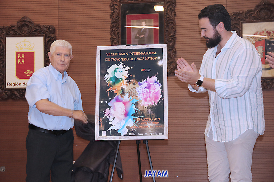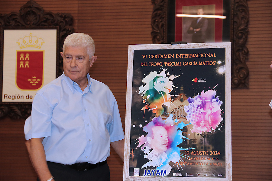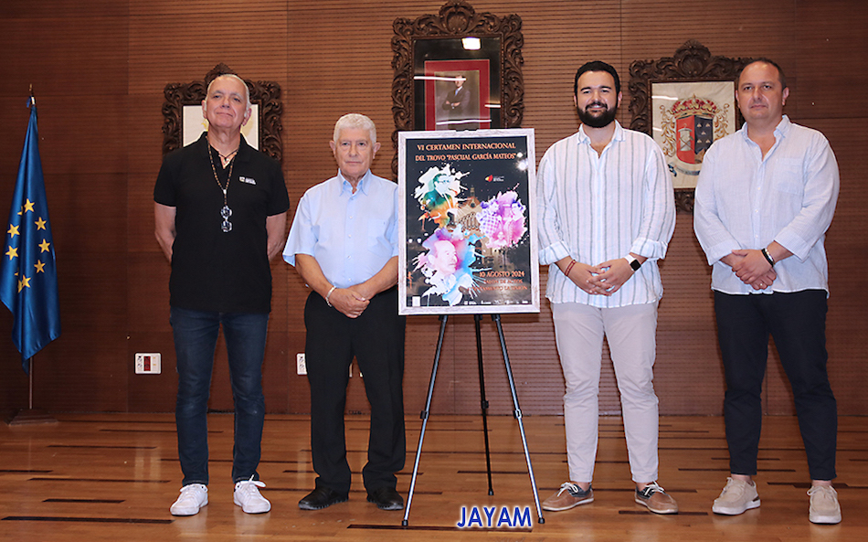 El alcalde de La Unión, Joaquín G. Zapata; el presidente de la asociación cultural Mesa-Café de la Unión, Federico García; el periodista Juan Ramón Lucas y el autor del cartel, Antonio Meroño (Jayam), se ha presentado esta mañana el cartel anunciador de la cuarta edición del certamen internacional del trovo 'Pascual García Mateos'.