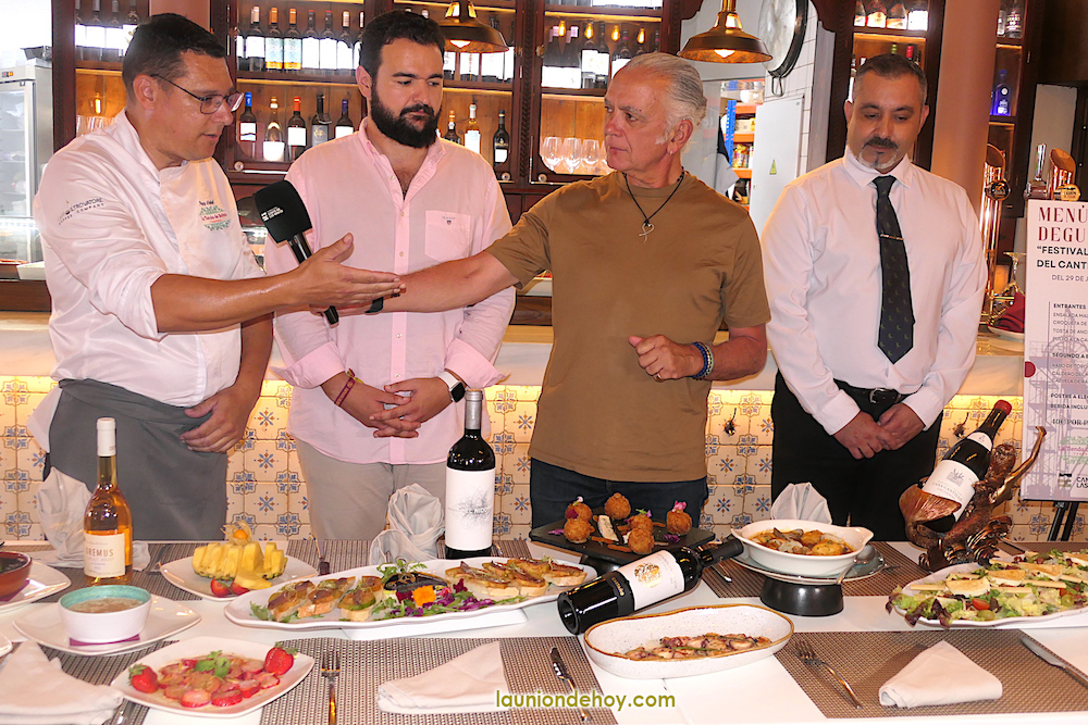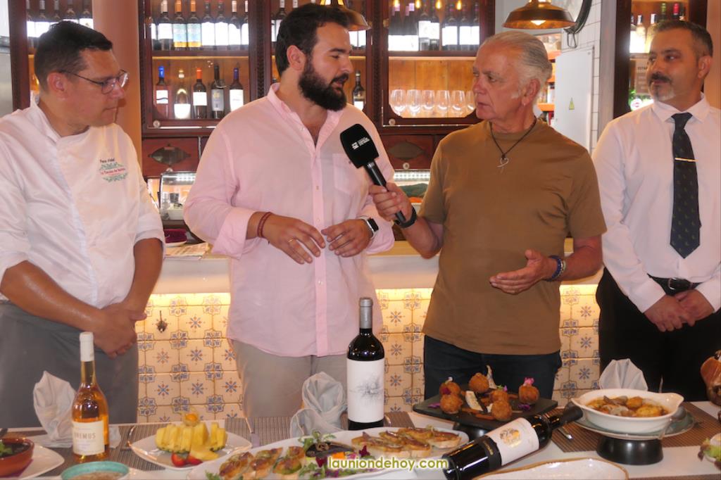 La taberna de El Garbanzal ofrecerá un variado menú de calidad, al precio de 40 euros, del 29 de julio al 11 de agosto, pudiéndose saborear tanto en el interior del local como en la terraza, donde habrá actuaciones flamencas. En la imagen, el jefe de cocina, Paco Vidal, responde a la pregunta del periodista Juan Ramón Lucas, en presencia del alcalde, Joaquín Zapata, y el jefe de sala, José María Pérez.