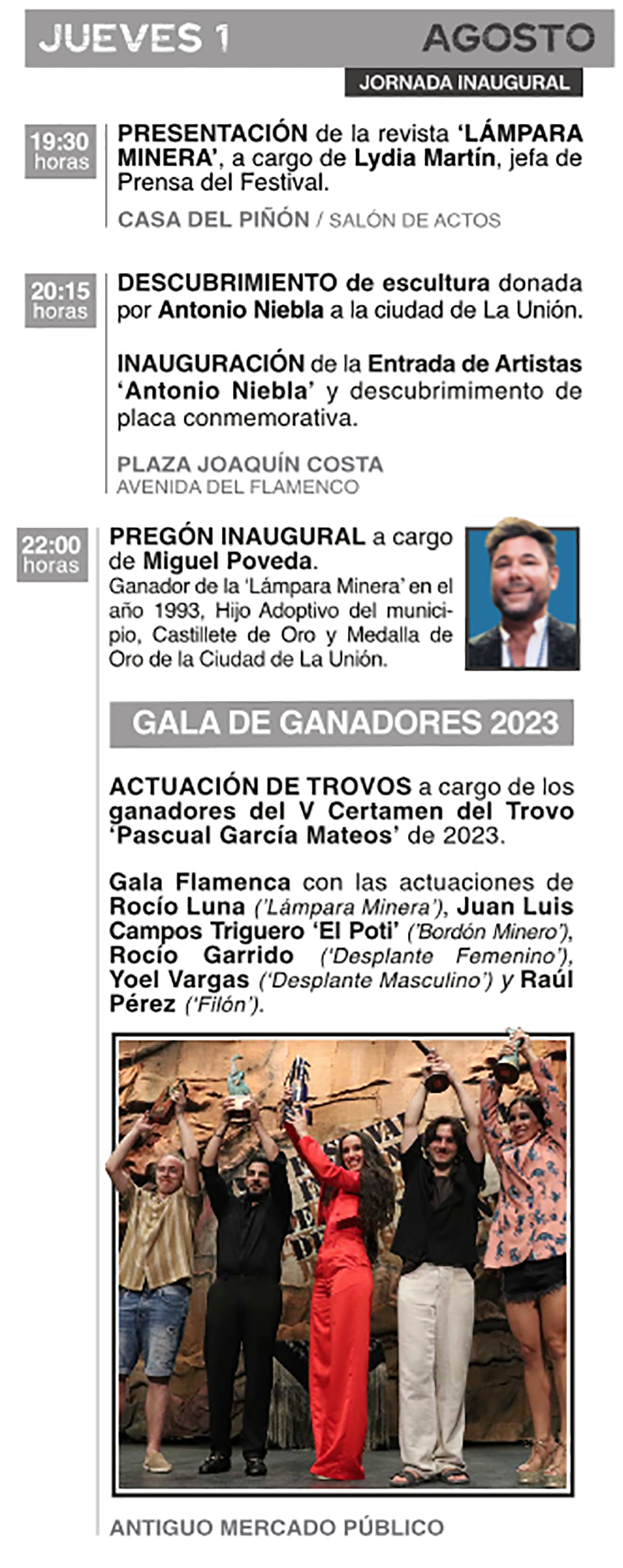 Tras el prólogo de ayer, hoy tiene lugar la primera jornada oficial, cuya actividad comienza a las 19.30 horas con la presentación de la revista 'Lámpara minera', después llegará el descubrimiento de la escultura donada por Antonio Niebla y la inauguración de la 'entrada de artistas', fijándose el siguiente foco en la 'Catedral del cante', donde Miguel Poveda ofrecerá el pregón y después actuarán los ganadores de 2023, con entrada gratuita.