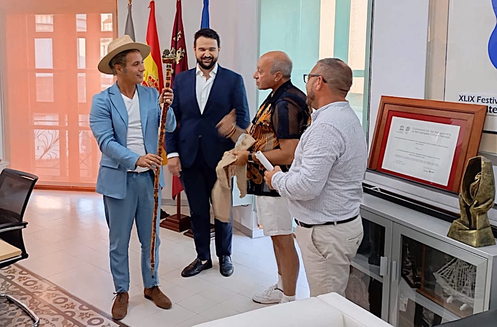 El cantaor flamenco ha recibido un ejemplar del bastón elaborado por Reinaldo Calle Esquinas con el grabado a fuego de 'Planta minera, pirita y plomo'. En la foto, ambos posan en la sede de la Alcaldia con el 'gallao' junto a José Antonio Beltrán, 'la voz de Reinaldo'.