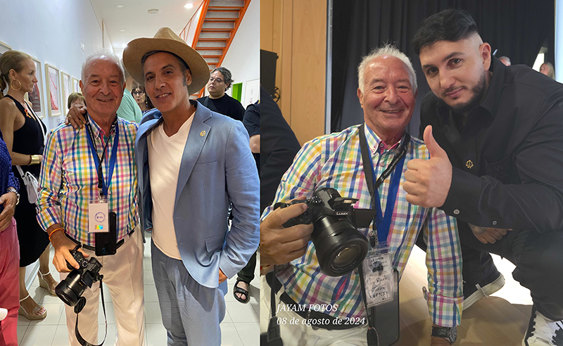 Agustín Ríos, Daniel Mateo Aroca y Ginés Cabezos Gomariz posan con Antonia Contreras ('Lámpara Minera 2016') y su esposo, el guitarrista Juan Ramón Caro. En las otras fotos de este artículo está Juan Pagán con Pitingo y con Omar Montes.