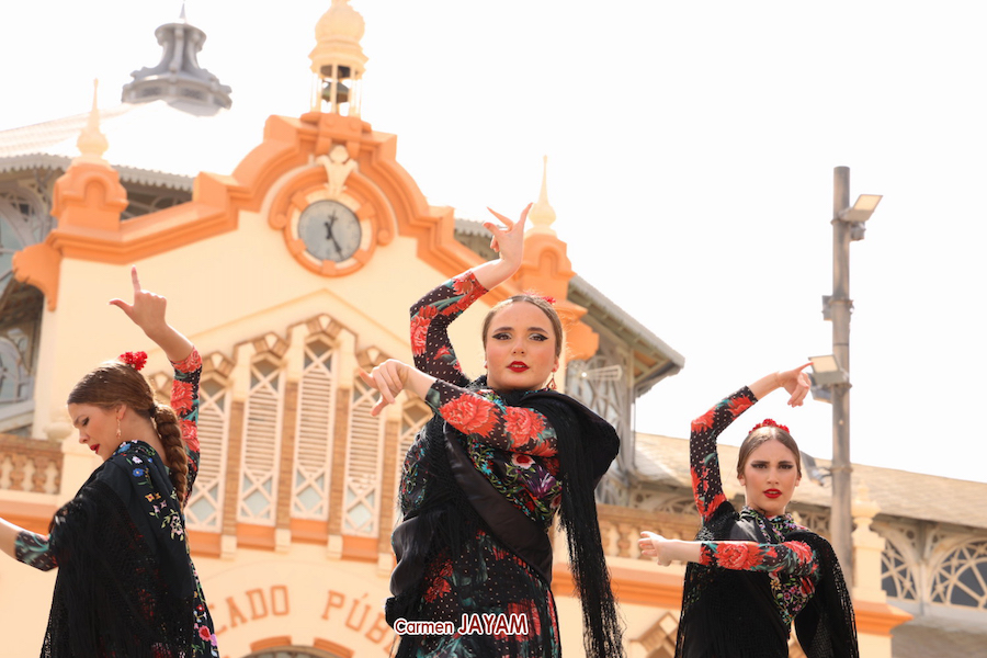 Qué agradable mañana en la hoy soleada plaza de Joaquín Costa de La Unión disfrutan de la espectacularidad del baile con la fachada del modernista Mercado Público de fondo.