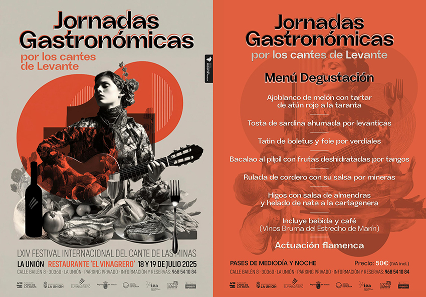 Las Jornadas Gastronómicas por Cantes de Levante ofrecen el menú tanto en horario de comidas como de cenas. El viernes 18, tras la comida, los comensales podrán disfrutar de la actuación flamenca de Paco Severo a la voz y Antonio Muñoz, guitarrista oficial del Cante de las Minas y ‘Bordón Minero’, al toque, y el día 19 con Muñoz al toque y Bastián a la voz. Ambos días, en horario de cenas, el espectáculo correrá a cargo de Pablo Barrionuevo a la guitarra y Celia Jiménez al cante.
