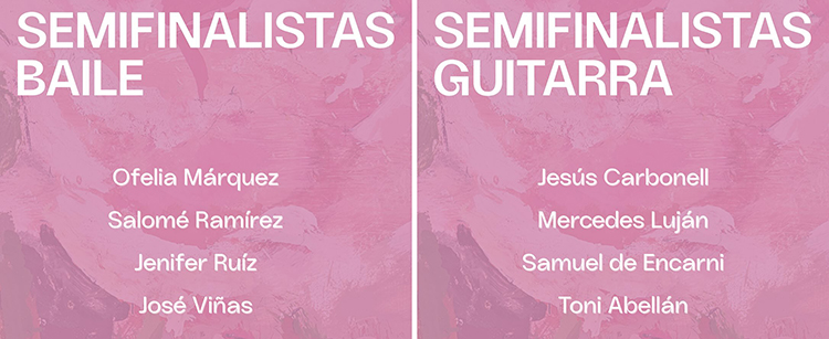 Serán cuatro los aspirantes al ‘Desplante’: desde Cádiz Ofelia Márquez Espinosa, Salomé Ramírez Almagro y José María Viñas Coca, y desde Almería Jenifer Ruiz Hilario. Por último, el ‘Filón’ se disputará entre tres instrumentos. Por un lado está la flauta de la extremeña María Antonia Suárez Montaño ‘Ostalinda’ y el violonchelo del madrileño Raúl Herrera Moreno, siendo el piano el instrumento predominante en esta edición con tres aspirantes: Juan Lorenzo Moya Maleno ‘Lorenzo Moya’ (Ciudad Real), José Carlos Esteban-Hanza Fernández (Almería) y Manuel Moreno Ramirez (Huelva). En los próximos días se compartirá el orden y días de actuación de cada uno de los artistas en las semifinales que tendrán lugar del 6 al 8 de agosto. La final será el día 9.