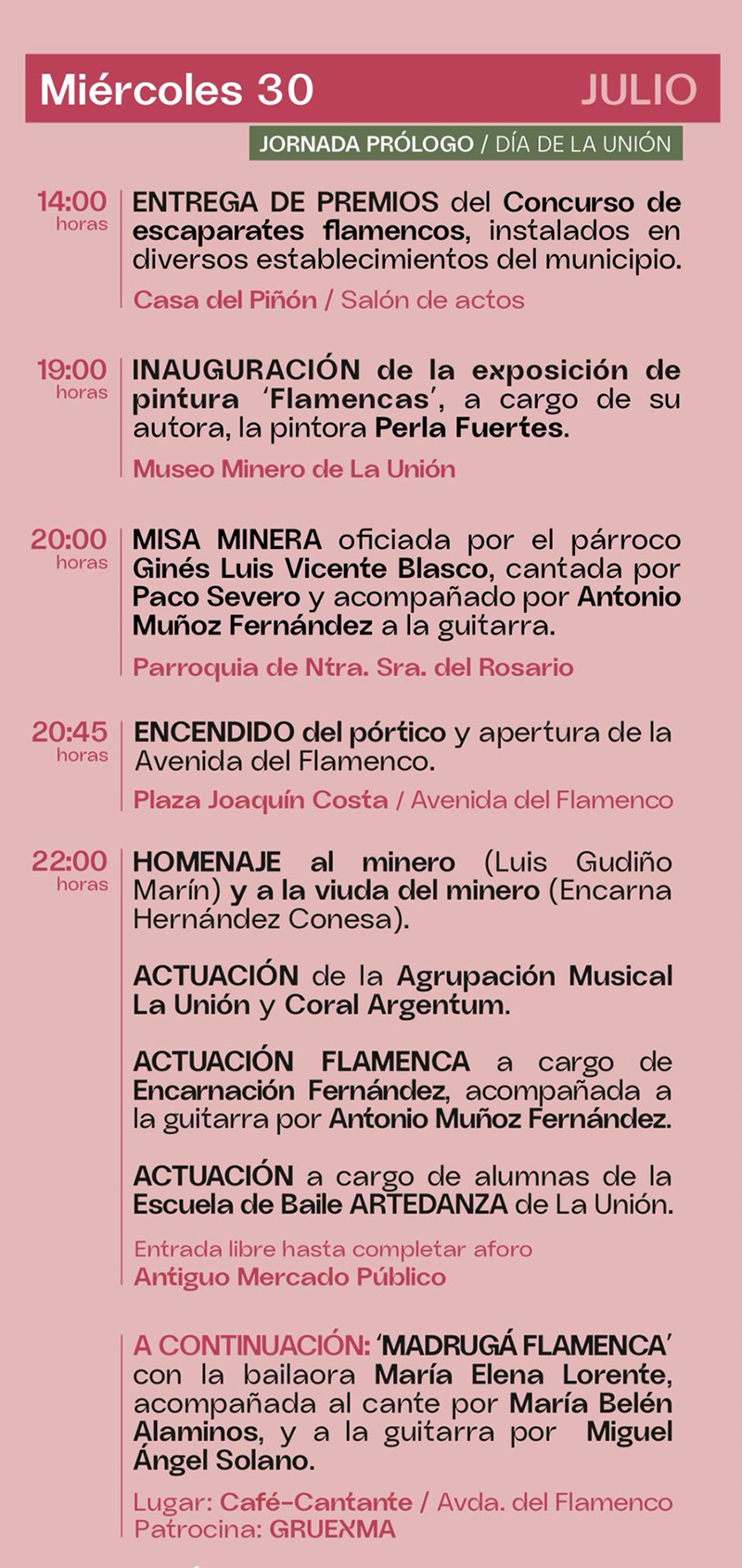 Tras esto, comenzarán los actos tradicionales que marcan esta jornada prólogo dedicada a La Unión: la Misa Minera en la parroquia Nuestra Señora del Rosario (20:00h) que este año interpretarán el cantaor Paco Severo y el guitarrista oficial del Festival Antonio Muñoz, y el posterior encendido del pórtico y la apertura de la ‘Avenida del Flamenco’ con sus estands y el Café Cantante.